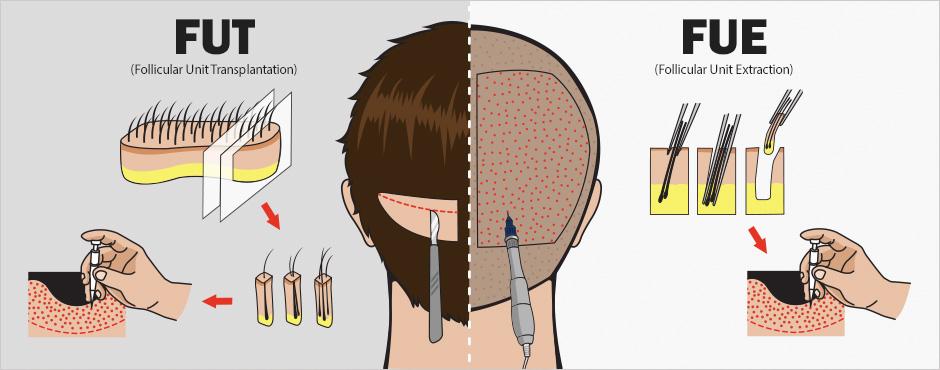 FUT (transplantacija folikularne jedinice), sa druge strane, gde se pod anestetikom trake koje sadrže mnogo folikula seče sa bočnih i zadnjih delova glave pacijenta. Te trake se zatim redistribuiraju po ćelavim površinama. FUT je jeftinija, ali treba duže zarastanje i može ostaviti gust ožiljak na kojem je uklonjena dlaka. Stoga se sada smatra zastarelim, a FUE je svakako  najbolja metoda.